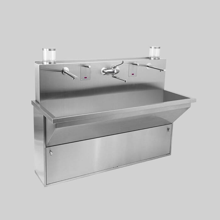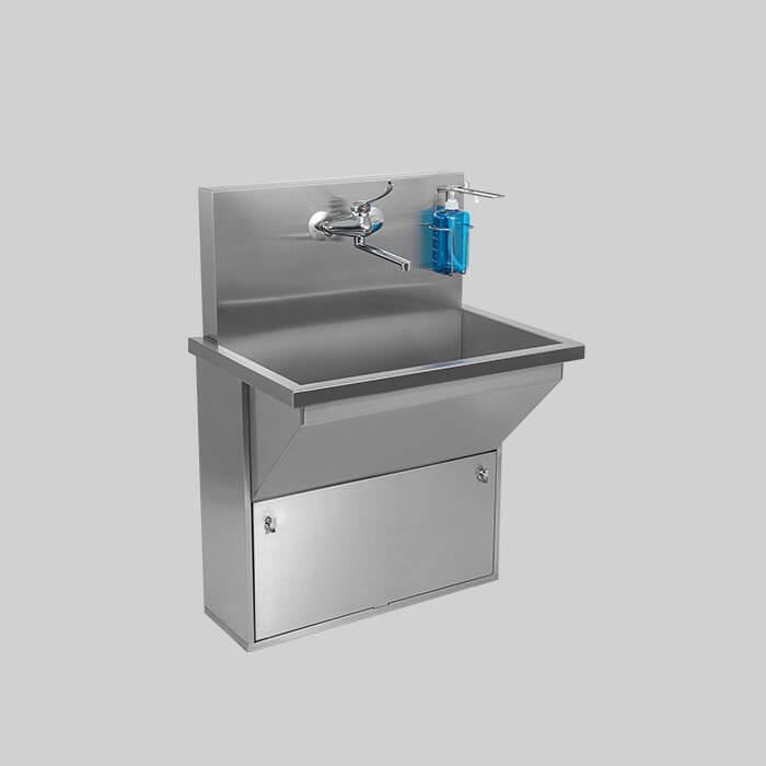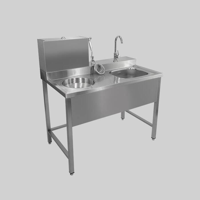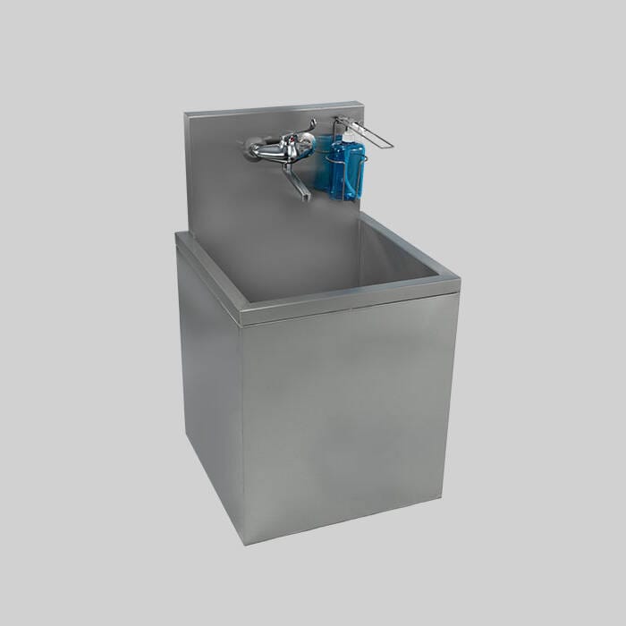 Basin dimensions are approximately 63 cm length x 65-70 cm width x 70 cm height. The basin includes a rear mirror with a height of approximately 45 cm and is equipped with a waste disposal tank. The tank has a water drainage machine. The basin includes a conical-shaped bowl made of Stainless Steel with a diameter of 35 cm x 40 cm depth. It has a bottom outlet of 4 inches for waste disposal.